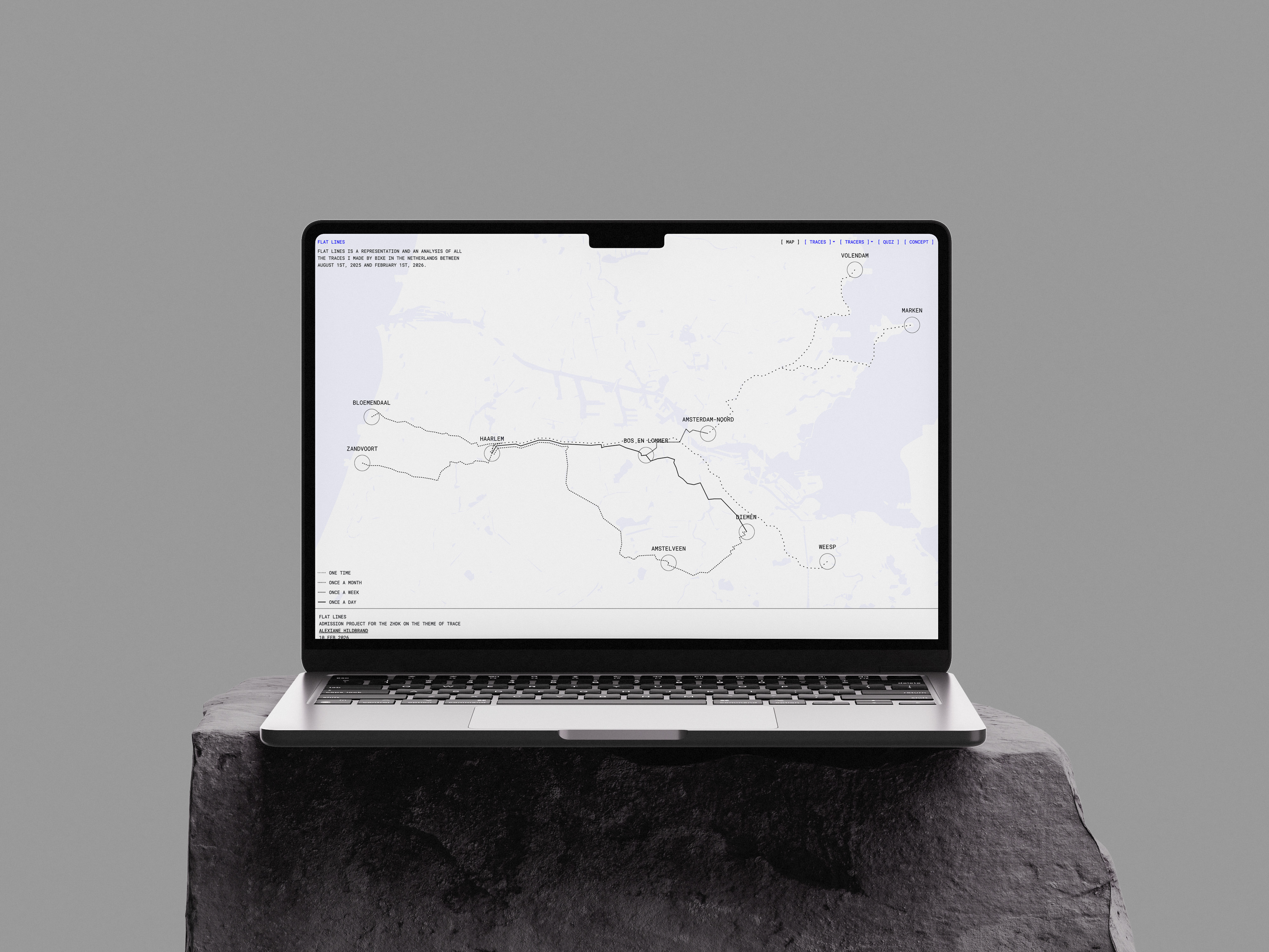 During my internship in communication at Wijstudio in Amsterdam (Aug 2025 – Mar 2026), I explored the theme Trace / Spur for the ZHdK Visual Communication Bachelor admission. Inspired by the marks I leave cycling across this flat country, I created an interactive site to explore my routes in detail.