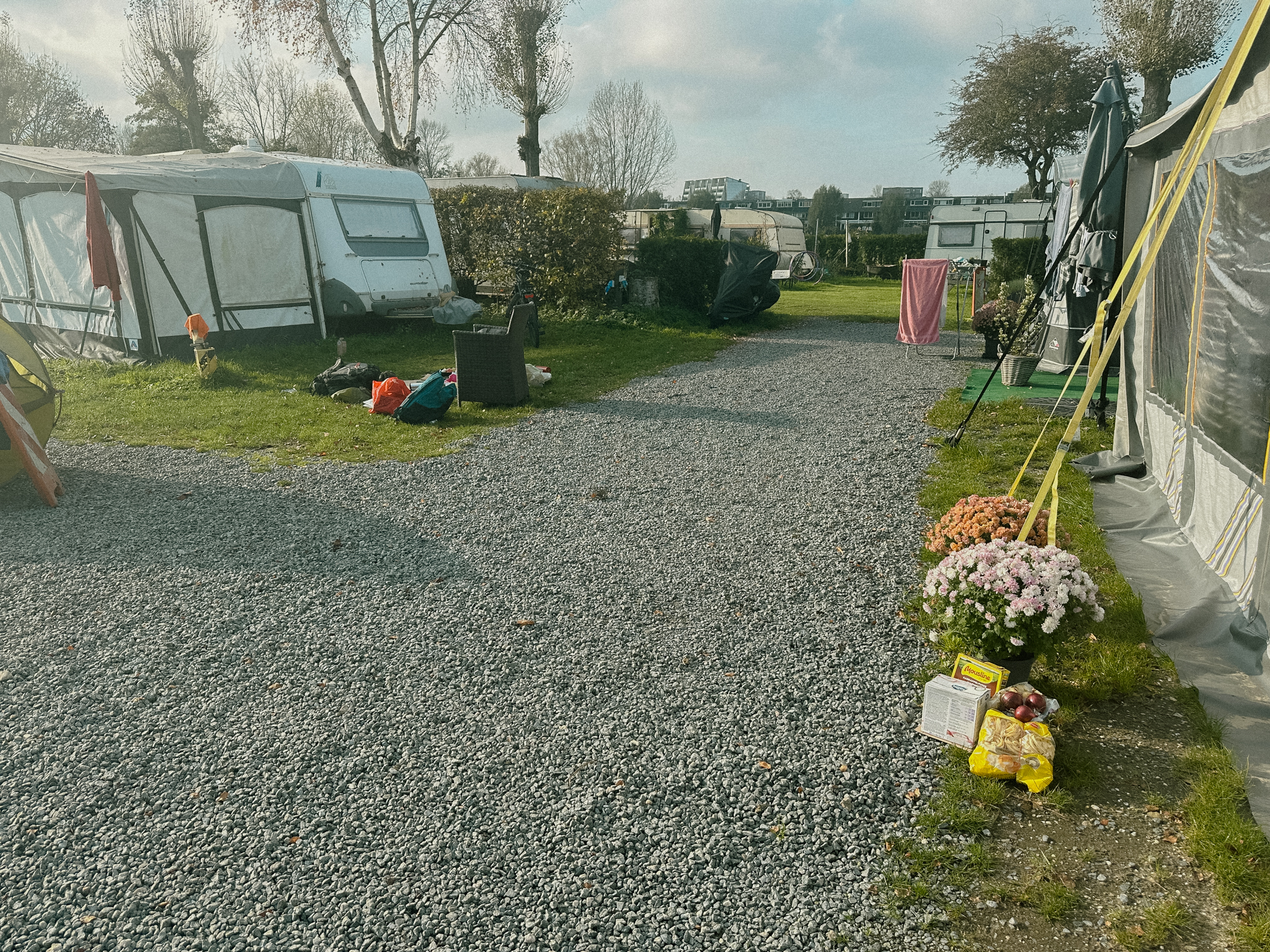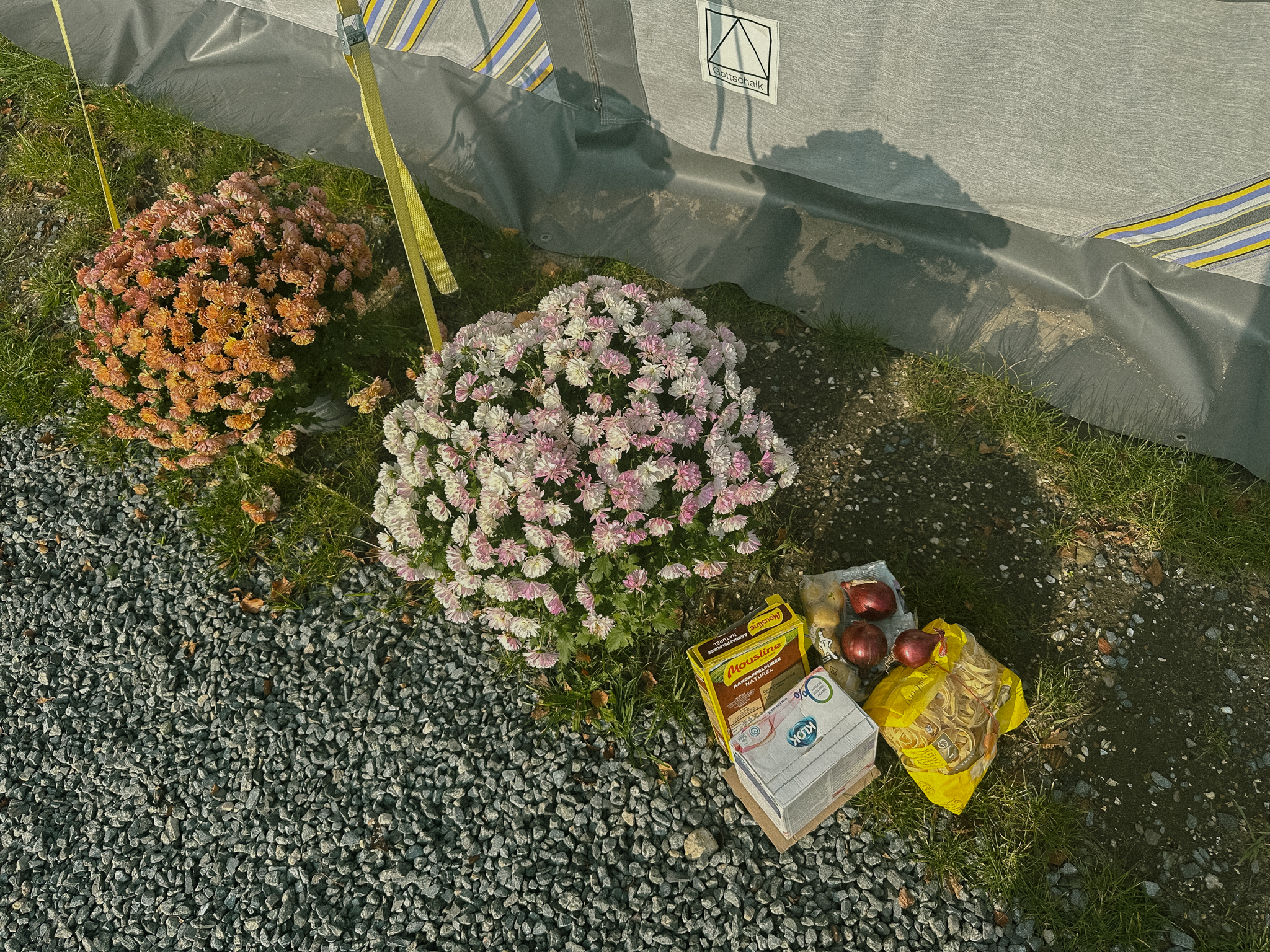 Ce matin, à mon réveil, j’ai trouvé des chrysanthèmes et plein de choses alimentaires devant ma caravane.